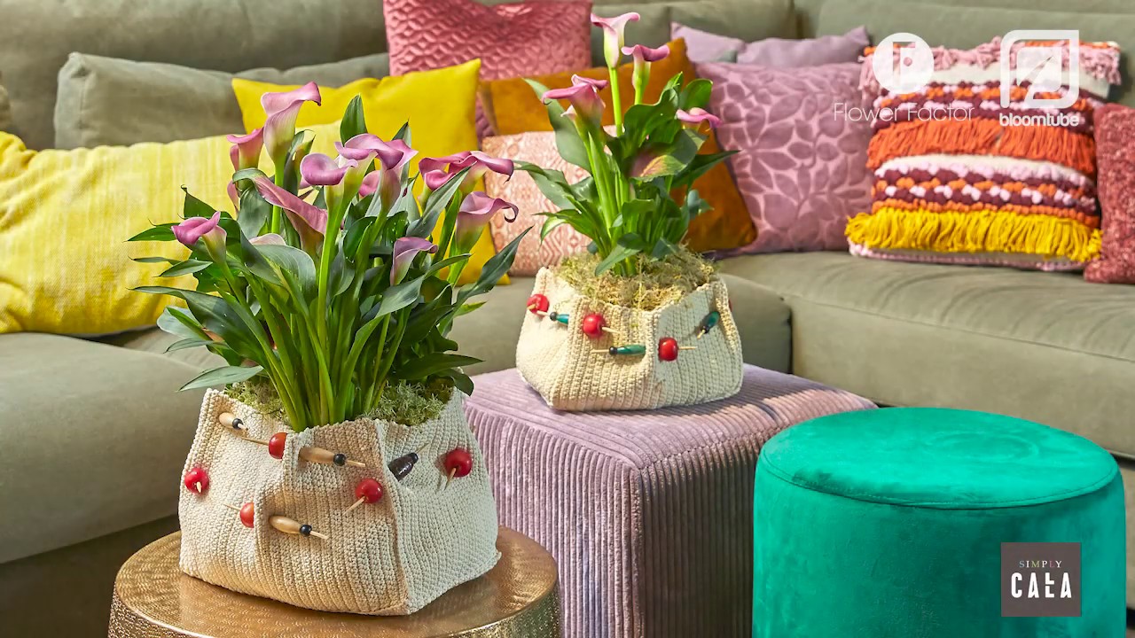 Lovely pink Calla plants are used in this arrangement. Roos van Unen places the Calla in a nice fabric planter and finishes it off with some wooden pins decorated with colourful beads and small apples. Some moss to top it off and you have yourself a simply Calla arrangement to dress up a cosy interior.