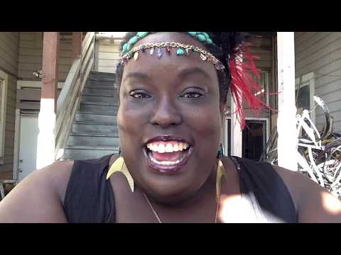 Image Description: Vanessa Rochelle Lewis, founder of Pleasureness Literary Acadamy and the Ugly Conference smiles wide facing viewers. Vanessa has dark skin and is wearing a black tank top, a bejeweled chain as a headband, a red feather in her dark hair, and large gold earrings that resemble fish tails with a blue stone at the top.