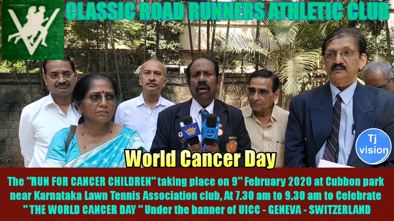 Tj vision media - 9341997936 the Classic Road Runners Athletic club Bangalore will be continuing the tradition of hosting the 16" Annual Road race with Run/walk event for all ages people to mark World Cancer Day-4 February. Taking place under the theme of "I Am and I Will", World Cancer Day is an opportunity for every one to unite and rally under the one banner of cancer in a positive and inspiring way to take part in a mass gathering in the Cancer Run Event. "Run/Walk on February 9"2020 under the Banner of UICC -Union for International Cancer Control Geneva Switzerland Therefore, we are uniting our community people for this world Cancer Day run to raise funds for Children with Cancer. Through our club. The "RUN FOR CANCER CHILDREN "taking place on 9" February 2020 at Cubbon park near Karnataka Lawn Tennis Association club at 7.30 am to 9.30 am to celebraate The World Cancer Dây by supporting the KIDWAL Cancer Institute of Bangalore to provide the funds for treatment to children diagnosed Cancer. Last year we have the fund raising through registration fee’s from all participants is Rs.1.58 Lakh and the entire amount is donated to “KIDWAI” Cancer Institute of Oncology,Bangalore.